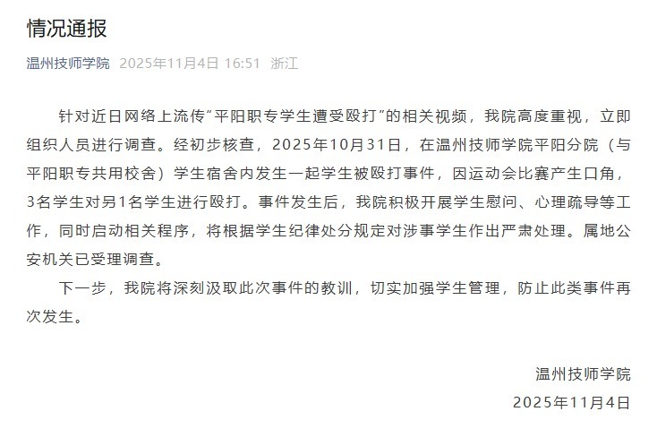 温州技师学院11月4日通报,针对近日网络上流传“平阳职专学生遭受殴打”的相关视频,学院高度重视,立即组织人员进行调查。经初步核查,2025年10月31日,在温州技师学院平阳分院(与平阳职专共用校舍)学生宿舍内发生一起学生被殴打事件,因运动会比赛产生口角,3名学生对另1名学生进行殴打。事件发生后,学院积极开展学生慰问、心理疏导等工作,同时启动相关程序,将根据学生纪律处分规定对涉事学生作出严肃处理。属地公安机关已受理调查。下一步河南股票配资网站,学院将深刻汲取此次事件的教训,切实加强学生管理,防止此类事件再次发生。