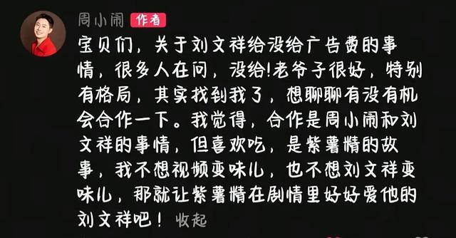 他甚至说过一句话:“合作是周小闹和刘文祥的事,但喜欢吃,是紫薯精的故事。我不想视频变味儿,也不想刘文祥变味儿。”